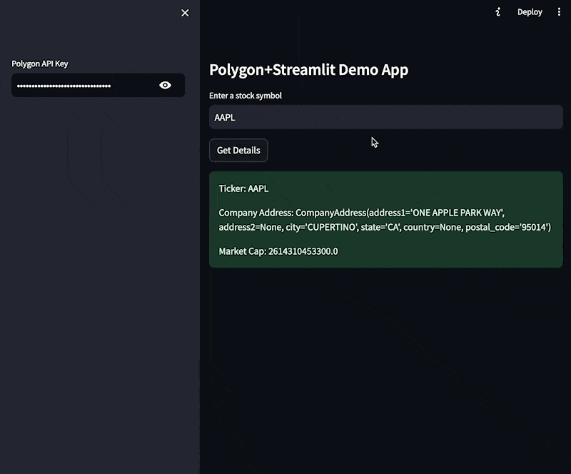 st.subheader("Massive+Streamlit Demo App") symbol = st.text_input("Enter a stock symbol", "AAPL") with st.sidebar: #Get your Massive API key from the dashboard. #In a real app you want to store this as a secret in your .env polygon_api_key = st.text_input("Massive API Key", type="password") # Authenticate with the Massive API client = RESTClient(polygon_api_key) col1, col2, col3 = st.columns(3)