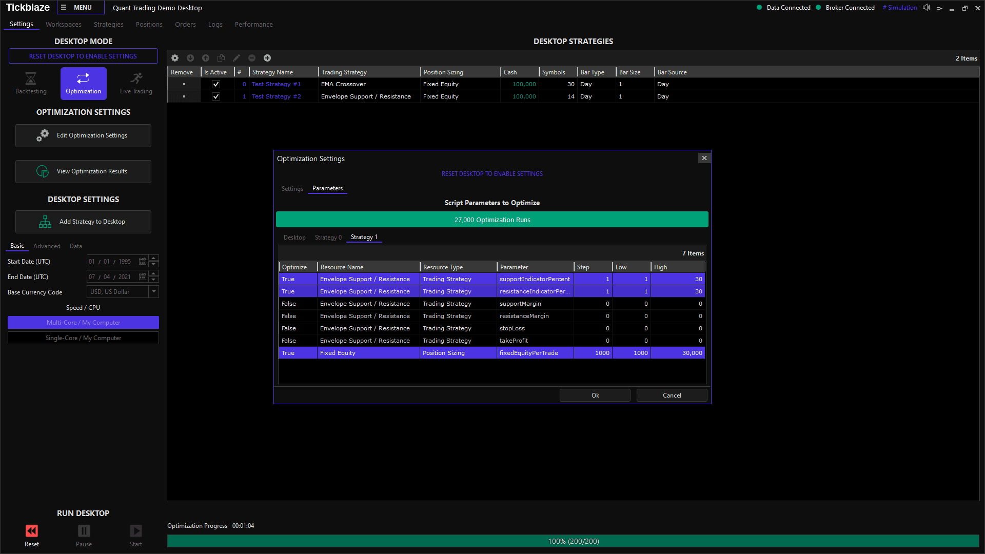 Tickblaze’s unique architecture enables you to not only backtest a portfolio of strategies but also to optimize one as well. This means that Tickblaze can automatically backtest your strategies again and again while tweaking script parameters until their optimal values are found.