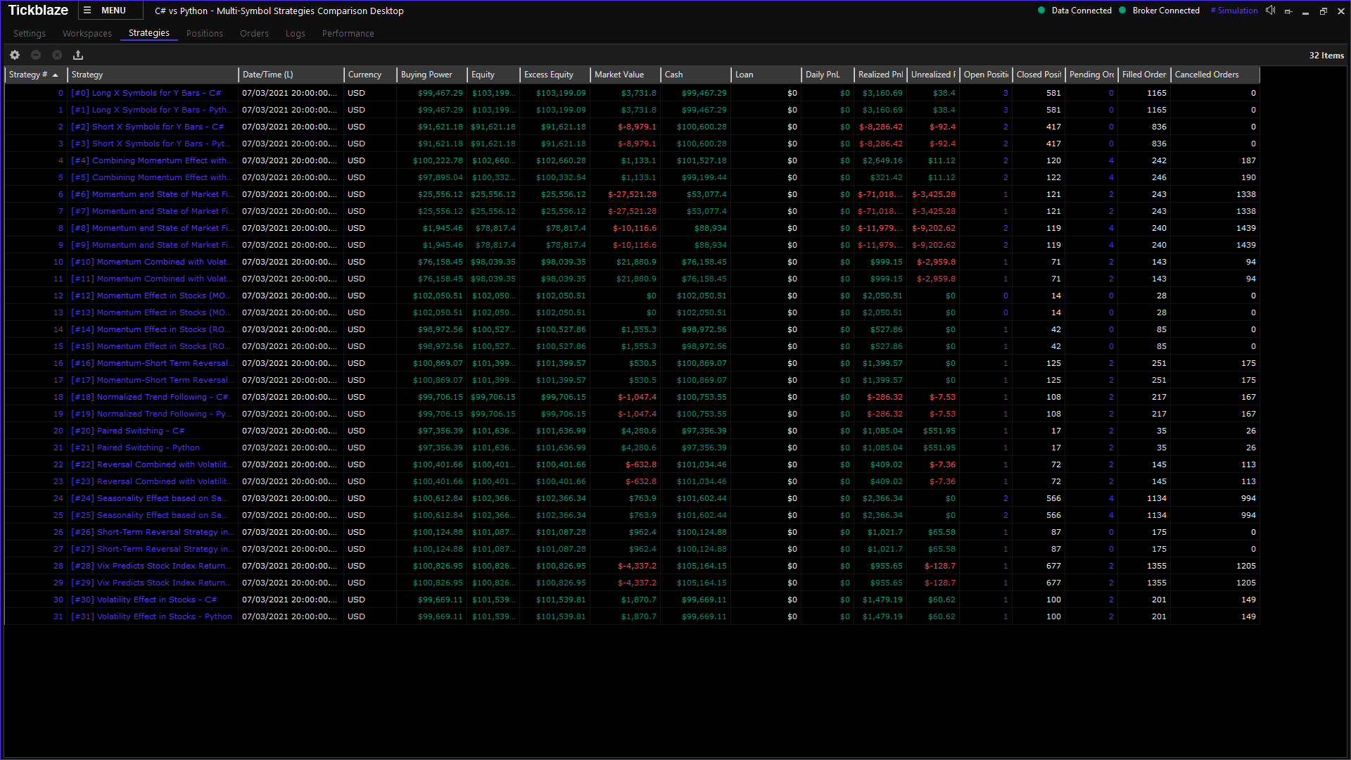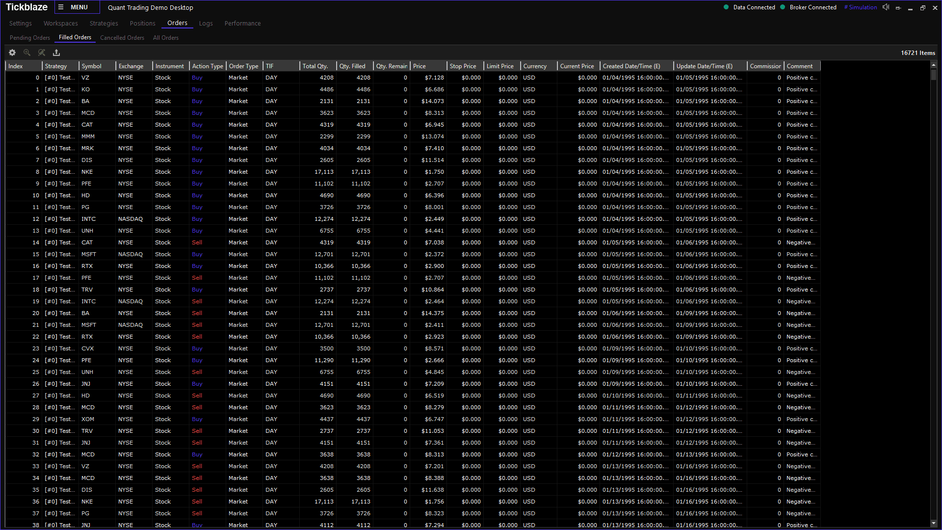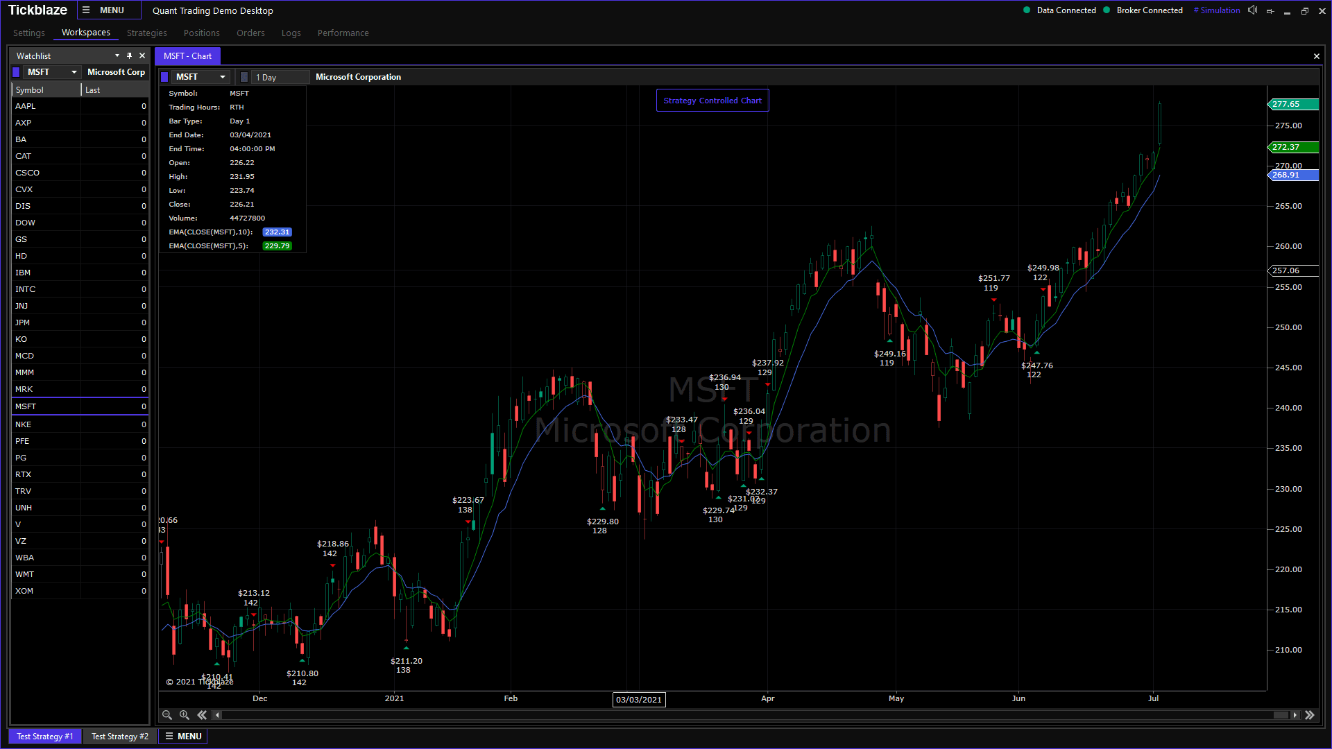 Quants can use Tickblaze and massive.com to design, backtest and execute a portfolio of trading strategies, either on their own local workstation or on the cloud. Each strategy in the portfolio is assigned a trading strategy script, an underlying bar interval, and one or more symbols. Tickblaze can backtest and trade both standard and exotic bar intervals, including ticks, minutes days, renko, range, and many others.