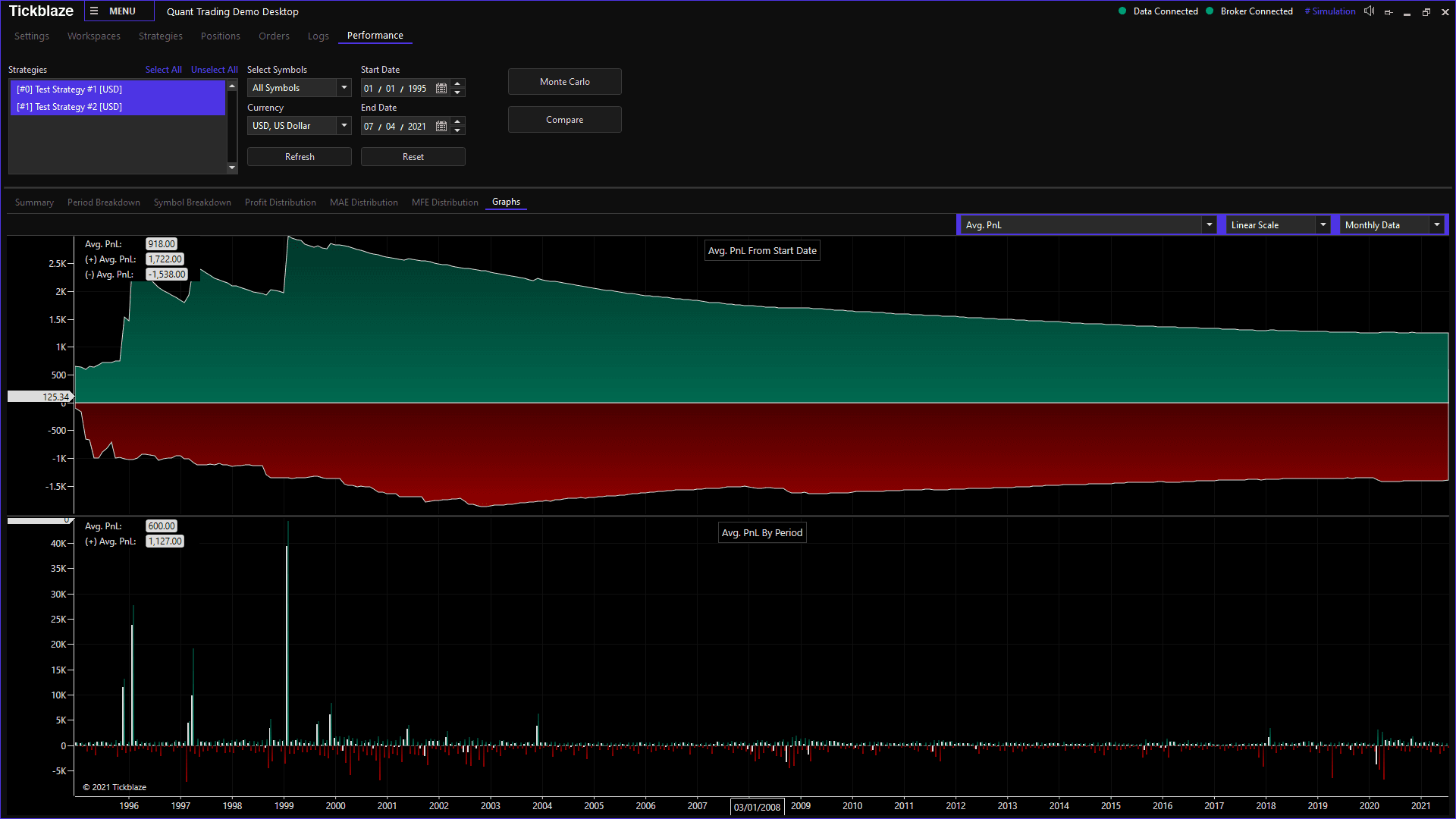 The platform is also equipped with advanced visualization tools which provide insight into the performance of your trading strategies. These include an extensive performance summary, multiple breakdowns, and dozens of charts, in addition to 3D optimization graphs and heat maps.