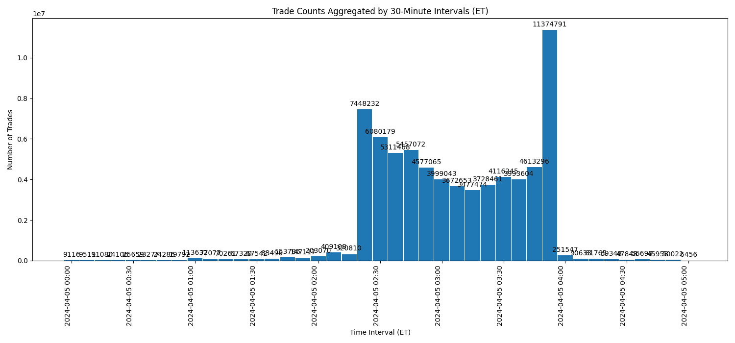 To visualize these dynamics, we can use a Python script to create a histogram aggregating trades into 30-minute intervals (code here), providing a clear view of when trading activity concentrates during the day. This analysis aims to highlight the distribution of trading volume across the day, from pre-market to after-hours.