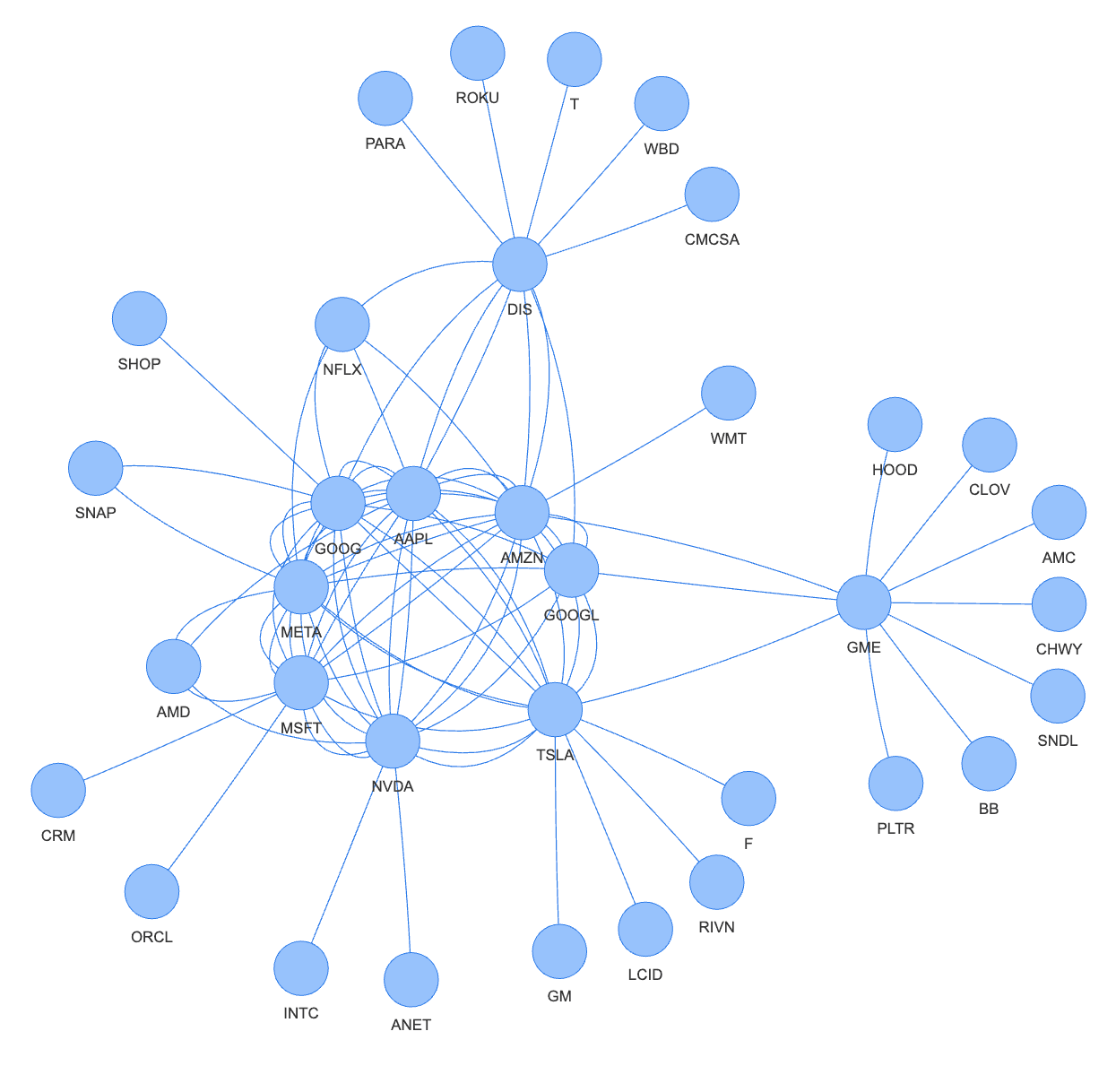 <!DOCTYPE html> <html lang="en"> <head> <title>Vis Network | Related Companies</title> <style type="text/css"> #mynetwork { width: 2400px; height: 1200px; border: 1px solid lightgray; } </style> <script type="text/javascript" src="https://unpkg.com/vis-network/standalone/umd/vis-network.min.js"></script> <script type="text/javascript"> var nodes = null; var edges = null; var network = null; function draw() { nodes = [{"id": 1, "label": "MSFT"}, {"id": 2, "label": "GOOGL"}, {"id": 3, "label": "NVDA"}, {"id": 4, "label": "AMZN"}, {"id": 5, "label": "GOOG"}, {"id": 6, "label": "META"}, {"id": 7, "label": "TSLA"}, {"id": 8, "label": "AAPL"}, {"id": 9, "label": "CRM"}, {"id": 10, "label": "ORCL"}, {"id": 11, "label": "AMD"}, {"id": 12, "label": "NFLX"}, {"id": 13, "label": "WMT"}, {"id": 14, "label": "DIS"}, {"id": 15, "label": "SNAP"}, {"id": 16, "label": "SHOP"}, {"id": 17, "label": "INTC"}, {"id": 18, "label": "ANET"}, {"id": 19, "label": "RIVN"}, {"id": 20, "label": "GM"}, {"id": 21, "label": "F"}, {"id": 22, "label": "LCID"}, {"id": 23, "label": "GME"}, {"id": 24, "label": "AMC"}, {"id": 25, "label": "HOOD"}, {"id": 26, "label": "BB"}, {"id": 27, "label": "CHWY"}, {"id": 28, "label": "CLOV"}, {"id": 29, "label": "PLTR"}, {"id": 30, "label": "SNDL"}, {"id": 31, "label": "WBD"}, {"id": 32, "label": "CMCSA"}, {"id": 33, "label": "PARA"}, {"id": 34, "label": "T"}, {"id": 35, "label": "ROKU"}]; edges = [{"from": 1, "to": 2}, {"from": 1, "to": 3}, {"from": 1, "to": 4}, {"from": 1, "to": 5}, {"from": 1, "to": 6}, {"from": 1, "to": 7}, {"from": 1, "to": 8}, {"from": 1, "to": 9}, {"from": 1, "to": 10}, {"from": 1, "to": 11}, {"from": 4, "to": 1}, {"from": 4, "to": 2}, {"from": 4, "to": 5}, {"from": 4, "to": 8}, {"from": 4, "to": 7}, {"from": 4, "to": 3}, {"from": 4, "to": 6}, {"from": 4, "to": 12}, {"from": 4, "to": 13}, {"from": 4, "to": 14}, {"from": 6, "to": 5}, {"from": 6, "to": 2}, {"from": 6, "to": 1}, {"from": 6, "to": 4}, {"from": 6, "to": 8}, {"from": 6, "to": 7}, {"from": 6, "to": 3}, {"from": 6, "to": 15}, {"from": 6, "to": 12}, {"from": 6, "to": 11}, {"from": 8, "to": 1}, {"from": 8, "to": 2}, {"from": 8, "to": 4}, {"from": 8, "to": 5}, {"from": 8, "to": 7}, {"from": 8, "to": 3}, {"from": 8, "to": 6}, {"from": 8, "to": 12}, {"from": 8, "to": 14}, {"from": 8, "to": 11}, {"from": 5, "to": 2}, {"from": 5, "to": 1}, {"from": 5, "to": 6}, {"from": 5, "to": 4}, {"from": 5, "to": 8}, {"from": 5, "to": 7}, {"from": 5, "to": 3}, {"from": 5, "to": 15}, {"from": 5, "to": 12}, {"from": 5, "to": 16}, {"from": 3, "to": 11}, {"from": 3, "to": 6}, {"from": 3, "to": 2}, {"from": 3, "to": 7}, {"from": 3, "to": 5}, {"from": 3, "to": 1}, {"from": 3, "to": 8}, {"from": 3, "to": 4}, {"from": 3, "to": 17}, {"from": 3, "to": 18}, {"from": 7, "to": 19}, {"from": 7, "to": 2}, {"from": 7, "to": 4}, {"from": 7, "to": 20}, {"from": 7, "to": 21}, {"from": 7, "to": 22}, {"from": 7, "to": 5}, {"from": 7, "to": 6}, {"from": 7, "to": 8}, {"from": 7, "to": 3}, {"from": 23, "to": 24}, {"from": 23, "to": 7}, {"from": 23, "to": 25}, {"from": 23, "to": 26}, {"from": 23, "to": 27}, {"from": 23, "to": 28}, {"from": 23, "to": 4}, {"from": 23, "to": 29}, {"from": 23, "to": 2}, {"from": 23, "to": 30}, {"from": 14, "to": 12}, {"from": 14, "to": 31}, {"from": 14, "to": 4}, {"from": 14, "to": 32}, {"from": 14, "to": 33}, {"from": 14, "to": 8}, {"from": 14, "to": 2}, {"from": 14, "to": 34}, {"from": 14, "to": 5}, {"from": 14, "to": 35}]; var container = document.getElementById("mynetwork"); var data = { nodes: nodes, edges: edges }; var options = { nodes: { shape: 'dot' } }; network = new vis.Network(container, data, options); } </script> </head> <body onload="draw()"> <div id="mynetwork"></div> </body> </html>