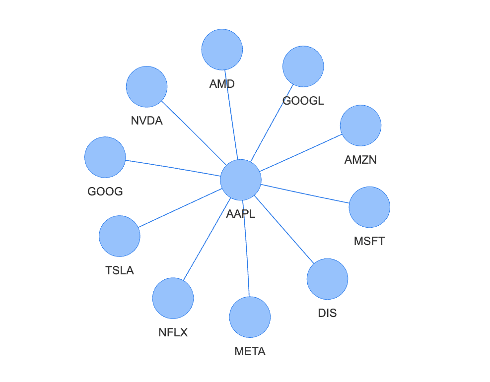 In this section, we will build on what we know already to construct a network graph to visualize the relationships between companies. Let’s start with the "Magnificent 7", those being Microsoft, Amazon, Meta, Apple, Alphabet, Nvidia, and Tesla. These companies are probably best known for their significant market performance, competition between each other, and frequent mentions in various contexts. By using vis.js, we can create dynamic graphs where each node represents a company, and the edges illustrate the strength and nature of their relationships.