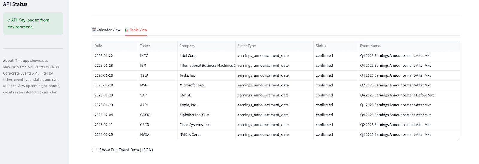 This demo is intentionally designed to be both educational and extensible. You can run it as-is to explore TMX Wall Street Horizon Corporate Events data, or use it as a reference for building your own event tracking tools, dashboards, or production workflows on top of Massive's API.