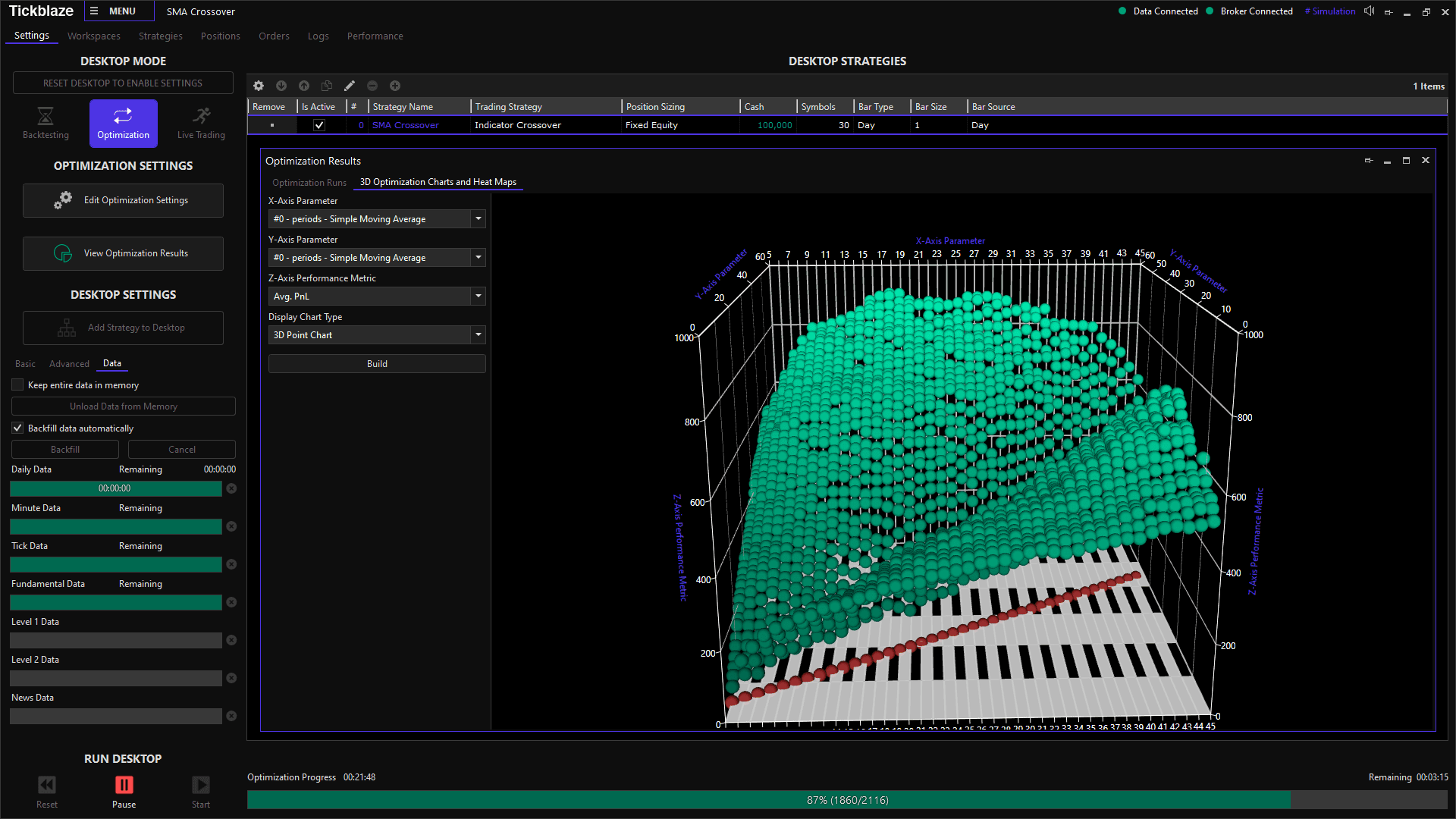 Tickblaze’s unique architecture enables you to not only backtest a portfolio of strategies but also to optimize one as well. This means that Tickblaze can automatically backtest your strategies again and again while tweaking script parameters until their optimal values are found.