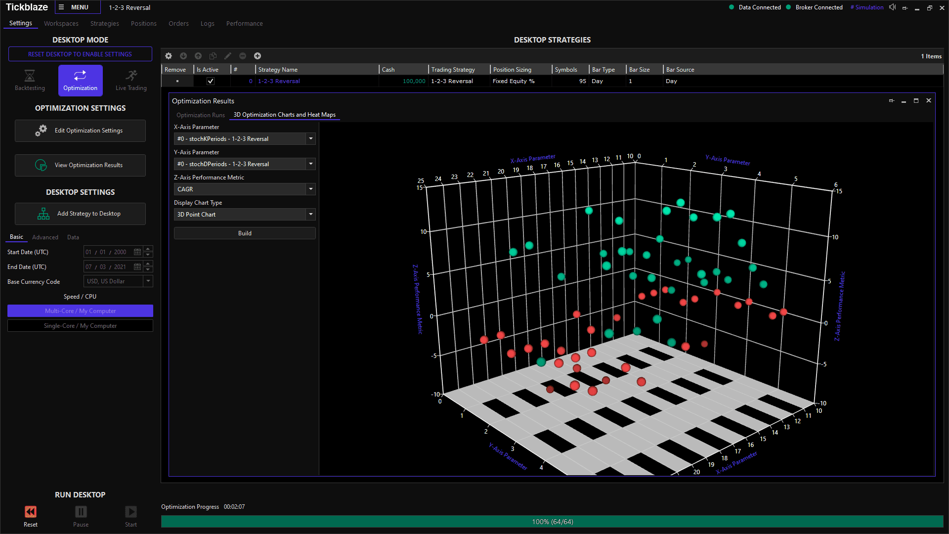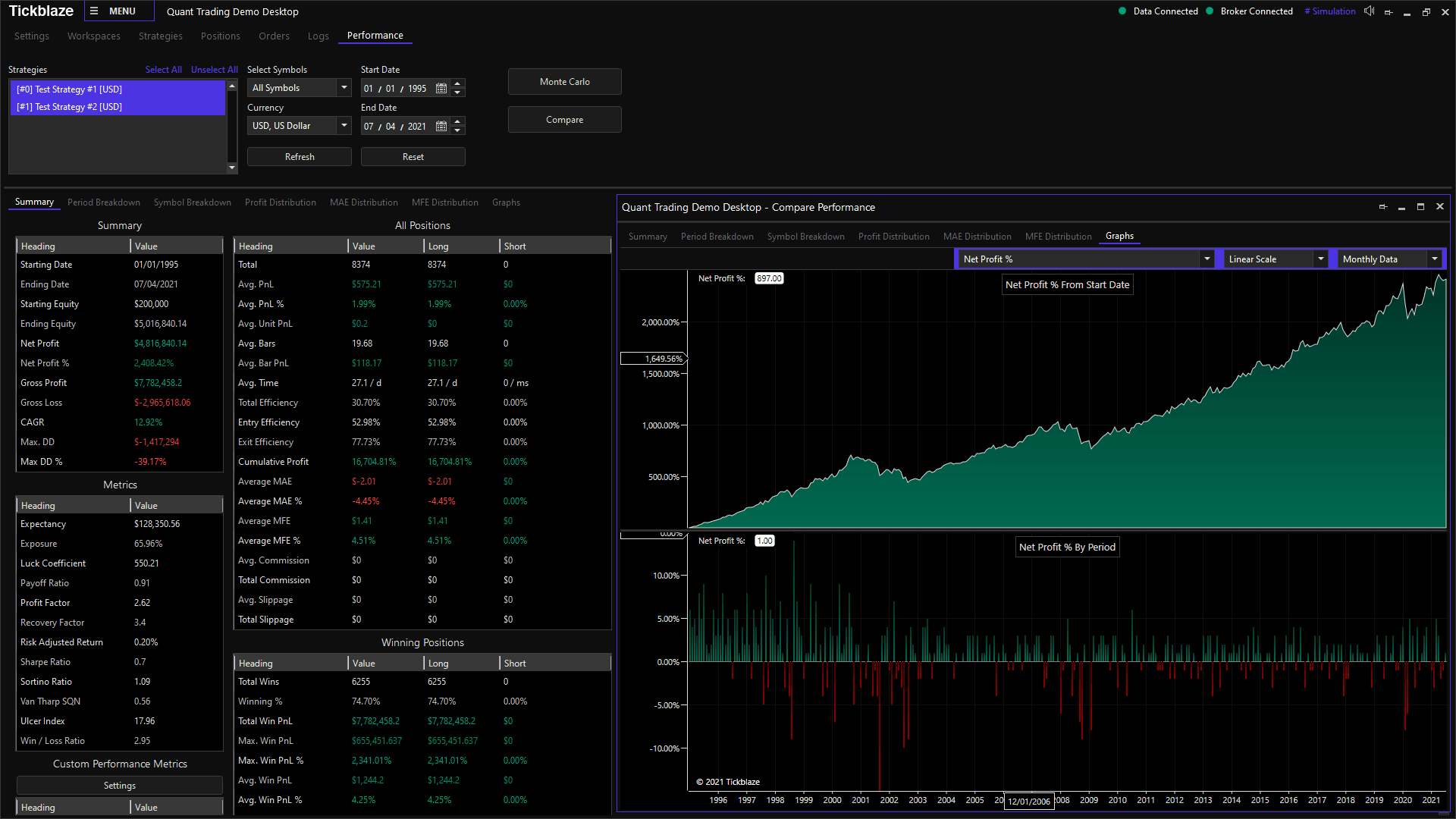 The platform is also equipped with advanced visualization tools which provide insight into the performance of your trading strategies. These include an extensive performance summary, multiple breakdowns, and dozens of charts, in addition to 3D optimization graphs and heat maps.