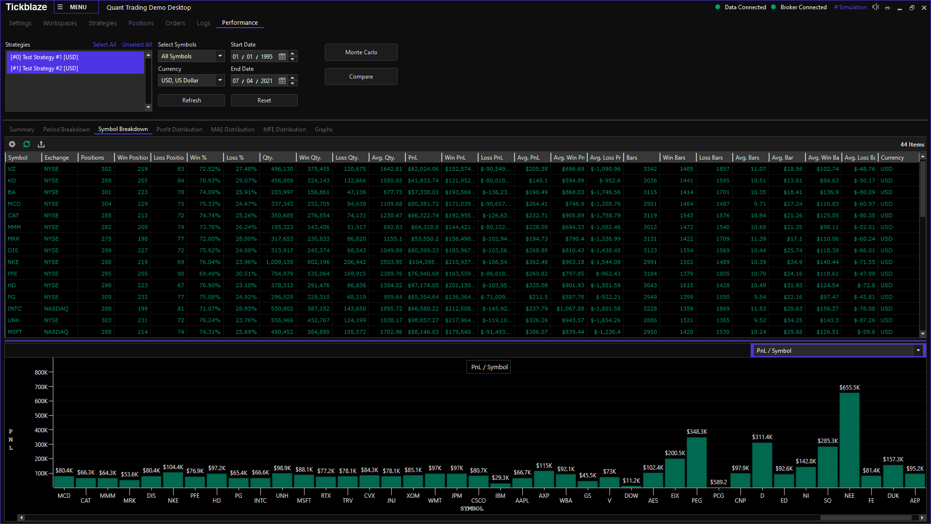 Quants can use Tickblaze and massive.com to design, backtest and execute a portfolio of trading strategies, either on their own local workstation or on the cloud. Each strategy in the portfolio is assigned a trading strategy script, an underlying bar interval, and one or more symbols. Tickblaze can backtest and trade both standard and exotic bar intervals, including ticks, minutes days, renko, range, and many others.